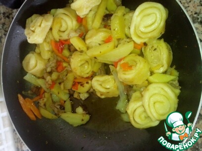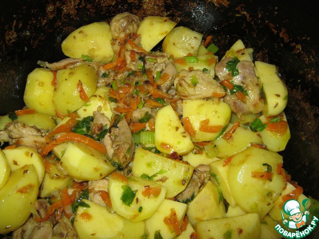 2 крупных луковицы или 3 средних. Шинкуем крупными полукольцами и добавляем к мясу. Морковь крупную шинкуем соломкой. Всё хорошенько перемешиваем, тушим. Добавляем сельдерей. Когда лук и морковь осядут, кидаем в казан крупно порезанный картофель. Перемешиваем. Обжариваем около 15 минут и заливаем водой до полного покрытия картофеля.