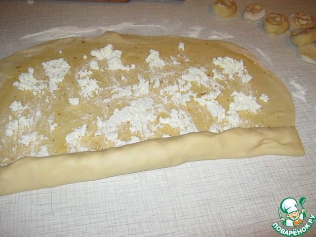 Теперь займемся штрудлями. Берём кусочек сливочного масла, кидаем на сковородку и на медленном огне растапливаем, добавляем к маслу чеснок (выдавливаем или натираем на мелкой тёрке). обжариваем чеснок в сливочном масле до потемнения. Снимаем с огня. Теперь, если вы не любите сильный запах чеснока, то чесночные шкварки можно выкинуть, оставив лишь масло. Я половину обжаренного чеснока кидаю в бульон с картофелем, а половину оставляю для начинки. Достаём наше тесто, делим его на 2 части. Каждую раскатываем в пласт, смазываем чесночным маслом посыпаем творогом. Сворачиваем в рулет, защипываем по длине (края защипывать не надо). Нарезаем рулет брусочками 1,5 - 2 см.