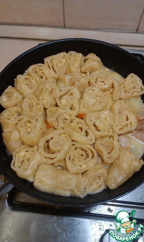 Как только бульон закипел, солим его, перчим по вкусу - можно добавить любимые специи, огонь убавляем и по всей поверхности казана укладываем наши штрудли. Если вы любите побольше бульона, то можете добавить жидкости, если нет, то вода должна покрывать штрудли лишь наполовину, штрудли будут готовиться на пару. Главное условие: во время приготовления не открывать крышку казана. Пусть она будет плотно закрыта на время приготовления штрудлей. Под крышкой штрудли готовятся 35 минут.
