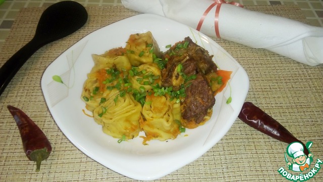 Вот так выглядит готовое блюдо. Не пугайтесь те, у кого нет в наличии казана. Это блюдо можно приготовить и в кастрюле. Главное, для начала обжарить курицу и овощи на сковороде, затем всё сложить в кастрюлю, залить водой, дать закипеть и выложить штрудли, закрыть крышкой и готовить на медленном огне 30-40 минут, не открывая. Но в случае с кастрюлей лучше будет добавить воды, так как в случае выкипания блюдо может подгореть.