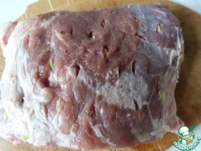 В свинине ножом делаем глубокие надрезы и начиняем чесноком