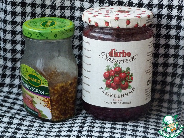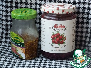 Теперь нужно в чашку (или какую другую ёмкость) отложить 4 ст. л. соуса "Клюквенный" от D’arbo" и 2 ст. л. зерновой горчицы