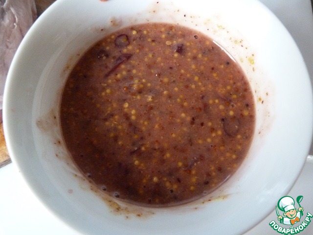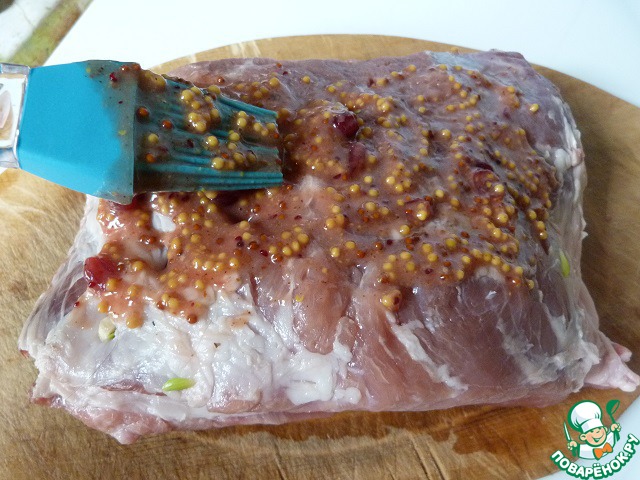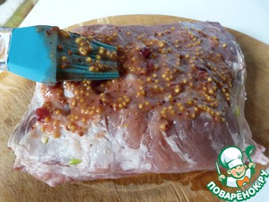 Клюквенный соус с горчицей как следует размешиваем. Этой смесью из клюквенного соуса и горчицы будем обмазывать кусок свинины