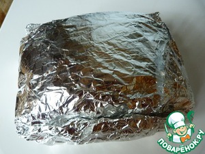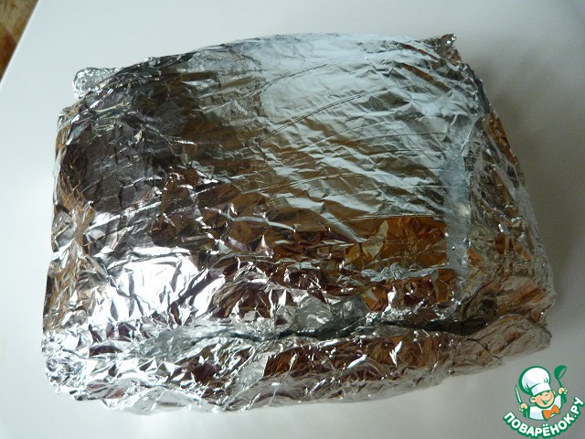 После того, как свинина будет хорошо обмазана, заворачиваем кусок мяса в фольгу (приблизительно слоя 3-4). Стараемся, чтобы фольга не порвалась и мясо было плотно завернуто. В таком виде даем полежать и "отдохнуть" мясу не менее 30 минут (можно оставить на бОльшее время).