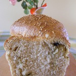 Смазываем подошедший хлеб взбитым яйцом и посыпаем (по желанию) кунжутом.