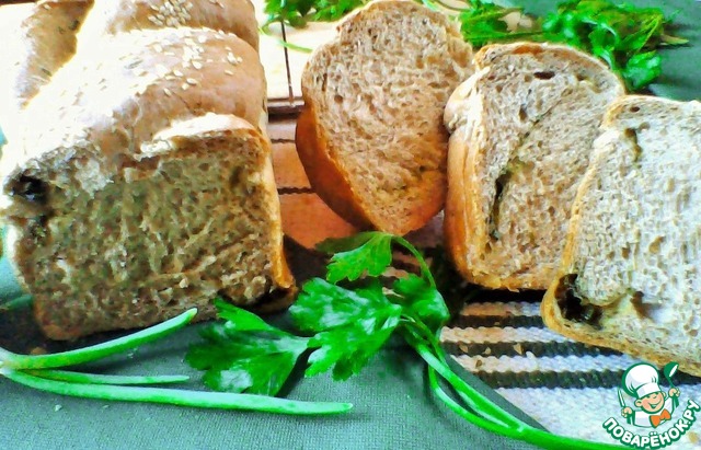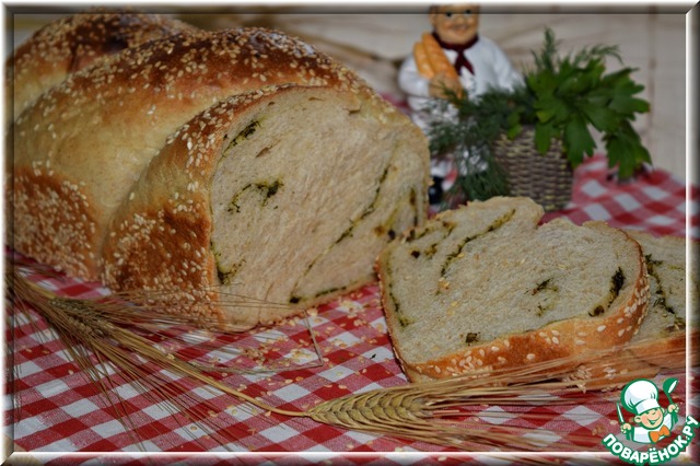 Дорогие поварята, хочу угостить Вас еще одним моим любимым рецептом хлеба. Хлеб готовится из смеси белой и цельнозерновой муки с добавлением в начинку ароматных трав. Именно такое сочетание для меня и моих родных стало любимым. С травами Вы можете поэкспериментировать.