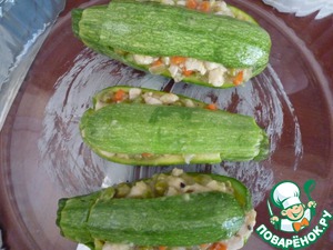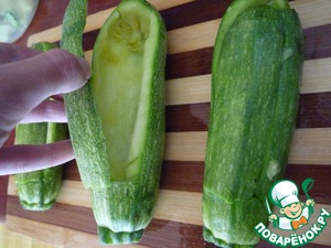 Для этого блюда предлагается брать кабачки (цуккини) длинной около 15 см. А вкусная, сытная начинка очень хорошо гармонирует со вкусом кабачка. Пробуем!