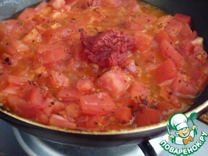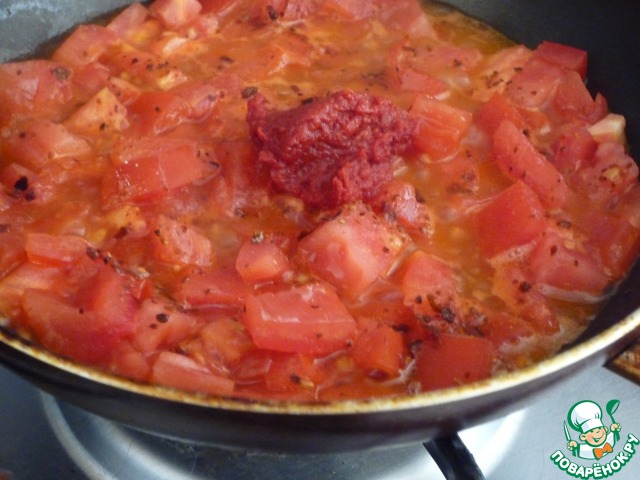 • В это время делаем соус томатный. Нарезаем кубиком помидор, тушим минут 5, затем добавляем томатную пасту, соль, перец красный и тушим еще 15 минут.