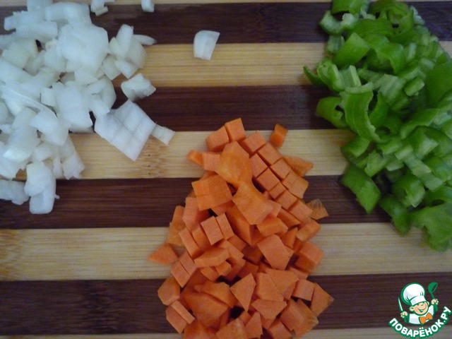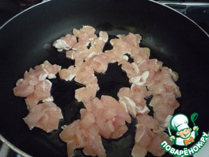 • Мелко нарезаем курицу и обжариваем ее на растительном масле.