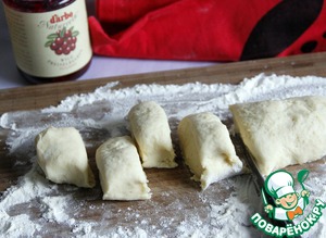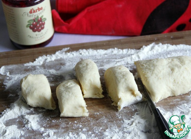 Слегка обмять его и сформировать рулетик, разделить ножом на равные части по 30-40 г (у меня получилось 6 шт)