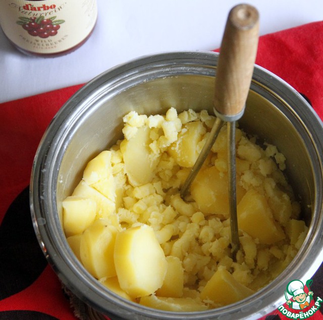 Отварить в подсоленной воде картофель, сцедить и хорошо размять. Отмерить 130 г и отложить в миску, где будет готовиться тесто, для остывания.