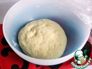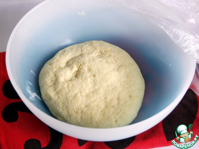 Тесто накрыть плёнкой, сверху положить полотенце и поставить на первую расстойку на 30-40 мин. в тёплое место (у батареи, например)