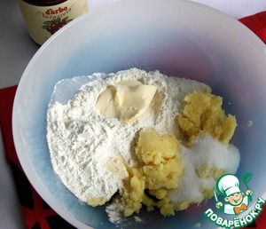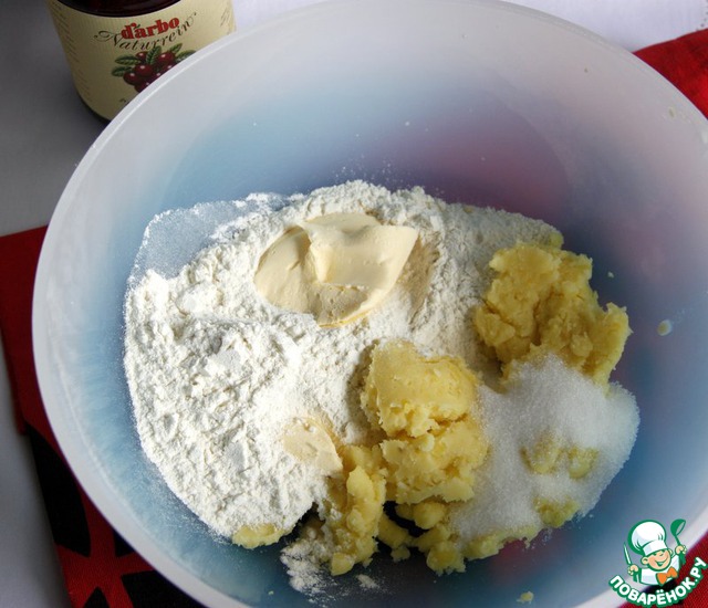 Для замеса теста: добавить в миску к остывшему картофелю муку, пекарский маргарин (или размягчённое сливочное масло), сахар, щепотку соли, разведённые в молоке дрожжи (или сухие дрожжи + молоко). Замесить мягкое тесто.