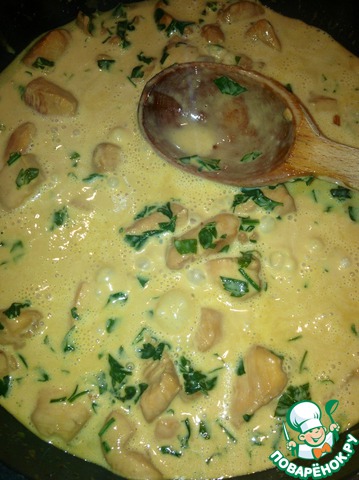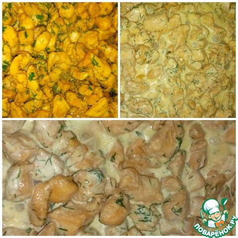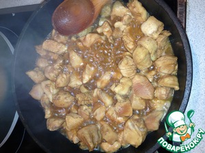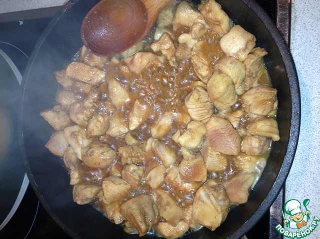 Жарим на сильном огне до тех пор, пока не испарится вся жидкость (а ее будет много) и курочка не приобретет темно-золотистый цвет. -