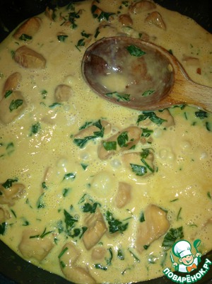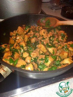 Теперь, когда испарилась вся жидкость, добавляем к курице петрушку и прожариваем все вместе еще пару минут.