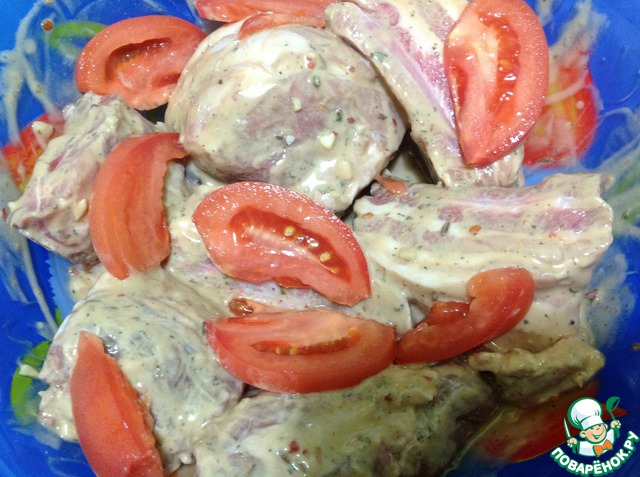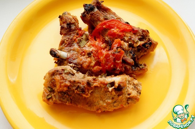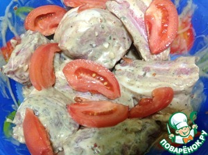 Порционно порезали ребра и промазали маринадом, уложили в емкость для маринования, сверху украсили порезанным помидором и убрали в холодильник не меньше чем на 2-3 часа. Я мариновала на ночь.