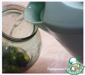 Заливаю банки с фейхоа доверху кипятком и оставляю до остывания воды (примерно час).