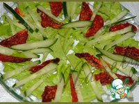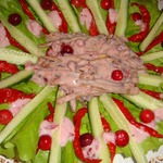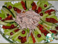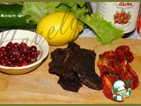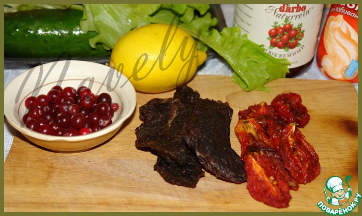 Описание: Это больше зимний вариант салата, так как используются вяленые помидоры и вяленое мясо, что придает сытость, а так же натуральный клюквенный соус, который богат витаминами. Прошу, угощайтесь.
