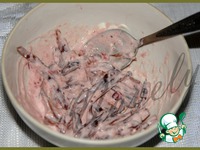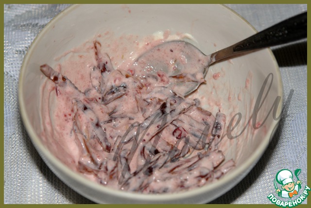 В серединку выкладываем наше мясо с заправкой, добавляем ягодки клюквы. И добавляем отложенную ранее заправку, просто хаотично сверху. |