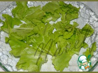 Тем временем на тарелку выкладываем промытые и обсушенные листья салата, его нужно порвать крупными кусками. |
