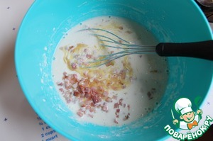 Для теста нам нужно нарезать мелко бекон и обжарить его, дать остыть.
