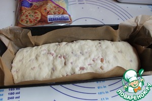 Размешаем в воде дрожжи, сахар, соль. Добавим бекон, масло сливочное мягкое. Постепенно добавим муку.