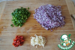 Из перчиков чили удалить семена и мелко их нарезать. -