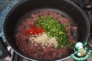 Добавить чеснок, зеленый лук и чили и готовить 30 сек.