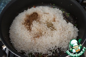 Всыпать рис, приправить орегано и зирой и готовить, помешивая, 2 мин.