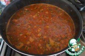 Влить горячий бульон, довести до кипения. Посолить и готовить на маленьком огне 20 мин.