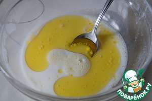 Остальное теплое молоко вылить в кастрюлю, добавить сахар, соль, масло и взболтанные яйца, перемешать.