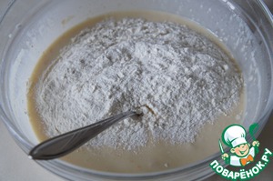 Сверху просеять 3 стакана муки, осторожно разровнять. На муку аккуратно вылить запенившиеся дрожжи и осторожно перемешать с мукой. Затем замесить тесто.