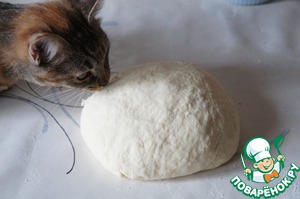 На стол просеять оставшийся стакан муки, вывалить тесто и месить, пока оно не станет гладким и не будет прилипать к рукам. Однако, не стоит слишком забивать тесто мукой, оно должно быть податливым, живым.