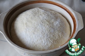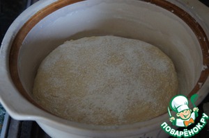 Скатать тесто в шар, положить в кастрюлю, припорошить мукой и поставить в теплое место на 1 час.
