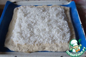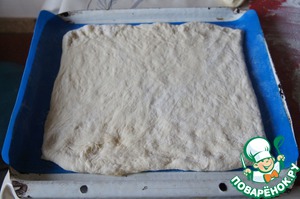 Вывалить тесто на стол. Отрезать чуть меньше половины и отложить. Оставшееся тесто раскатать в квадратный пласт толщиной примерно с палец.