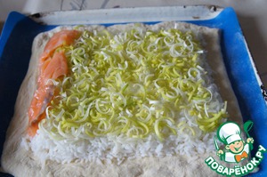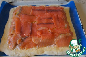 Рыбу нарезать тонкими пластинками и выложить на тесто, закрыв, "стянув", полностью кашу.