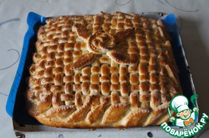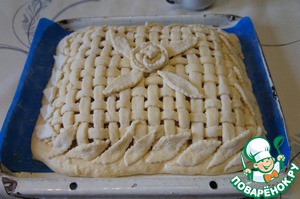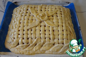 Оставшееся тесто нарезать полосками, сделать на пироге решетку. Из остатков и обрезков вырезать листики.
