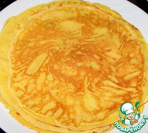 Жарим тонкие блины по диаметру сковороды ( 28 см ). Сковороду нагреть, но смазывать маслом не надо. Последний блин получился немного меньше. Всего 6 блинов.