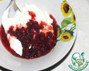 Готовим начинку для налистников. Творог смешать с брусничным соусом.