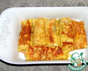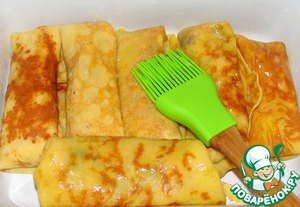 Блин завернула рулетиком ( нижним краем налистника прикрыла начинку, затем загнула оба края с боков и закрутила вверх ). Положила в смазанную маслом форму и верх рулетиков тоже смазала маслом.