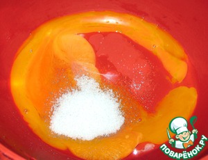 Желтки отделить от белков и вылить в миску. Растереть их с сахаром.