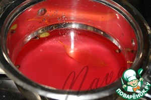 Для начала нужно приготовить маринад. Соединим в кастрюле воду, винный уксус, сахар, специи, доведем до кипения, прокипятим пару минут и оставим остывать.