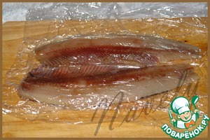 Филе сельди положить на пищевую пленку, сверху накрыть так же пленкой и слегка отбить, не переусердствуйте. -