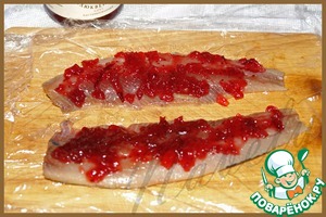 На каждую половинку сельди выкладываем по половине столовой ложки клюквенного соуса D'arbo, распределяем по всему филе