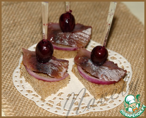 Вкусно очень сделать вот такие канапешки, на греночки из ржаного хлеба положить колечко лука, кусочек селедочки, маринованной с клюквенным соусом, добавить маслинку или оливку, у меня маринованный виноград. Очень вкусно!!!