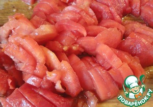 Помидоры надрезаем крестом, обдаем кипятком, снимаем шкуру, режем ломтиками.