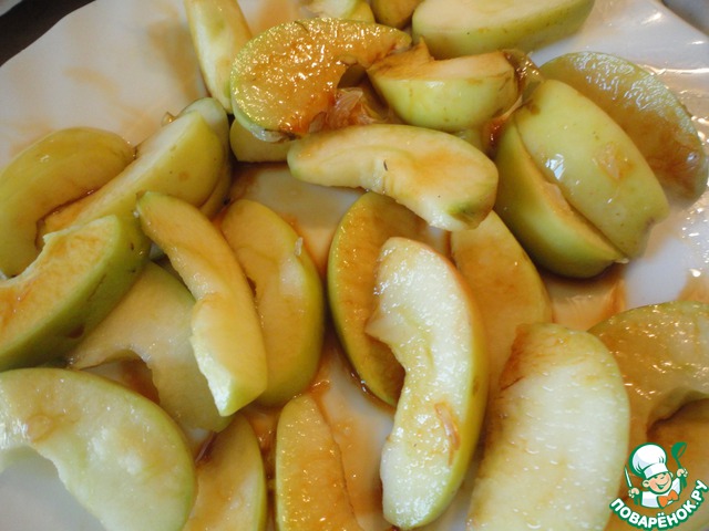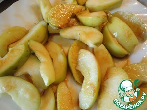 Яблоко режем дольками, сбрызгиваем лимонным соком и соевым соусом.