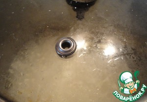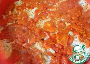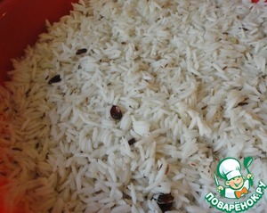 Рис поливаем остатками маринада из пакета, в котором вырезка мариновалась и 6-ю столовыми ложками воды.