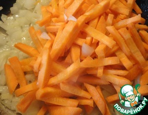 Морковь режем брусочками, относительно толстыми, 3-4 мм. Моркови должно быть много. Она и сама выходит очень вкусной, хорошо вбирая ароматы специй и рису отдает свой вкус.