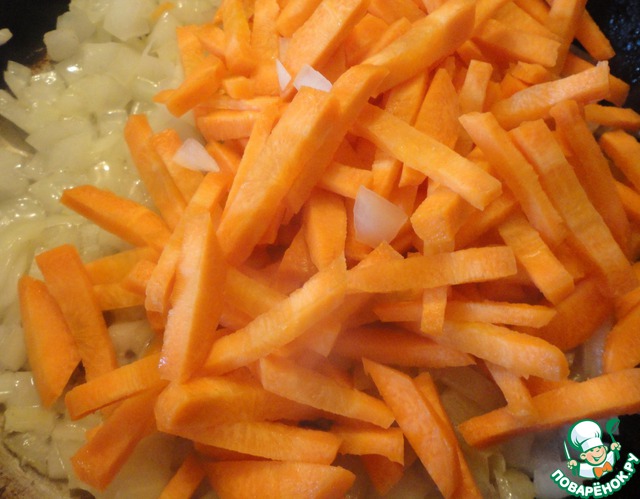 Добавляем морковь и жарим вместе до поджаристой корочки у моркови.